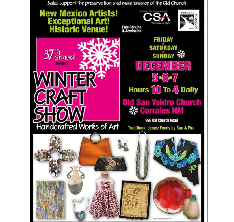 37th Annual Winter Craft Show Dates: December 5, 2025 - December 7, 2025 Recurrence: Recurring daily Location: Casa San Ysidro 973 Old Church Rd, Corrales, NM 87048 Time: 10:00 AM to 4:00 PM Visit Website Add to Trip Overview New Mexico Artists | Exceptional Art | Historical Venue December 5 - 6 - 7 | 10 am to 4 pm Daily Sales support the preservation and maintenance of the Old Church. Map