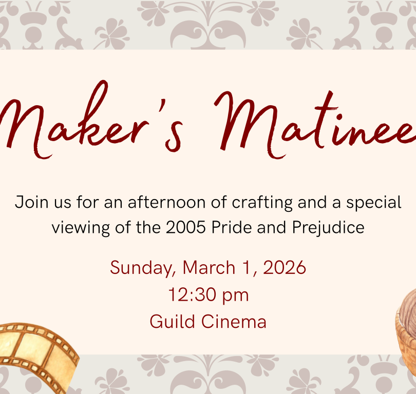 Lights will be dimmed low enough to watch the movie and bright enough to work on whatever projects you’d like to bring. Grab your yarns, looms, and needles — we welcome you to bring whatever will fit in your seat!