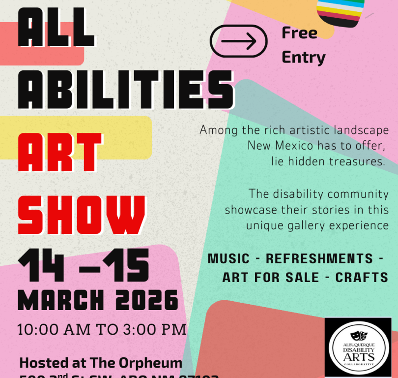 ADAC All Abilities Arts Show Presented By: Albuquerque Disability Arts Collaborative (ADAC) Dates: March 14, 2026, March 15, 2026 Location: Orpheum Community Hub 500 2nd St SW, Albuquerque, NM 87102 Email: info@adacnm.org Phone: (505) 451-4175 Time: 10:00 AM to 3:00 PM Price: FREE Visit Website Add to Trip Overview ADAC presents the All Abilities Art Show! Among the rich artistic landscape New Mexico has to offer, lie hidden treasures. The disability community showcase their stories in this unique gallery experience. We are still recruiting artists, preference given to people with disabilities and their supporters. Contact 505-451-4175 or info@adacnm.org for more information or to register as an artist, crafter or vendor. Map