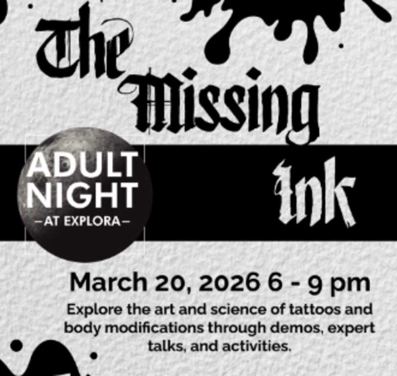 Adult Night: The Missing Ink Dates: March 20, 2026 Location: Explora 1701 Mountain Rd. N.W., Albuquerque, NM 87104 Time: 6:00 PM to 9:00 PM Price: Members: Free Adults: $14 Students/Senior/Military: $11 Visit Website Add to Trip Overview Explore the art and science of tattoos and body modification through demos, expert talks, and activities. Snacks available from Three Sisters Kitchen. Beer and wine from Sheehan Winery. This is an 18+ event. Map