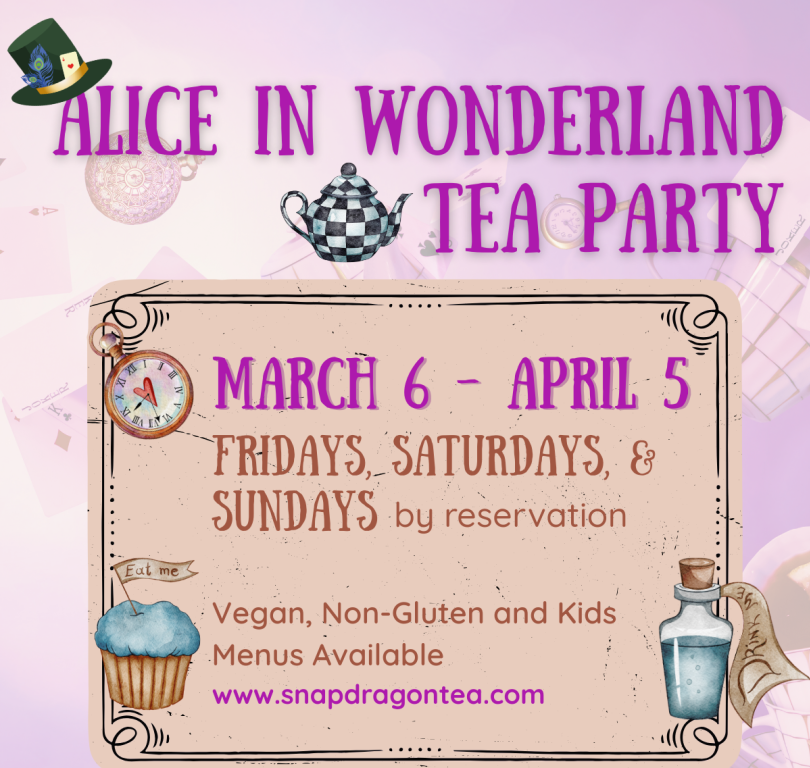 Alice in Wonderland Tea Party Presented By: Snapdragon Tea Dates: March 6, 2026 - April 5, 2026 Recurrence: Recurring weekly on Sunday, Friday, Saturday Location: Snapdragon Tea 115 Harvard Dr. S.E., Retail #7, Albuquerque, NM 87106 Email: info@snapdragontea.com Phone: (505) 750-2040 Time: 10:00 AM to 4:00 PM Price: $18.50 - $34.95 Get Tickets Visit Website Add to Trip Overview Don't be late, Don't be late, for a very important date! It's back! Our Alice in Wonderland Tea Party. Fun for the whole family, all ages welcome. We have kids tea, as well as vegan, vegetarian, and non-gluten options. Click the link below to view the menu and book your tea party today. Map