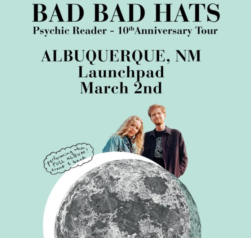 Bad Bad Hats Dates: March 2, 2026 Location: Launchpad 618 Central Ave SW, Albuquerque, NM 87102 Time: 8:00 PM to 11:00 PM Price: $20.00 Visit Website Add to Trip Overview Bad Bad Hats - Psychic Reader 10th Anniversary Tour with special guest MargauxMarch 2, 2026 • 8:00 pm - 11:00 pmDOORS 7:00pm • All Ages Map