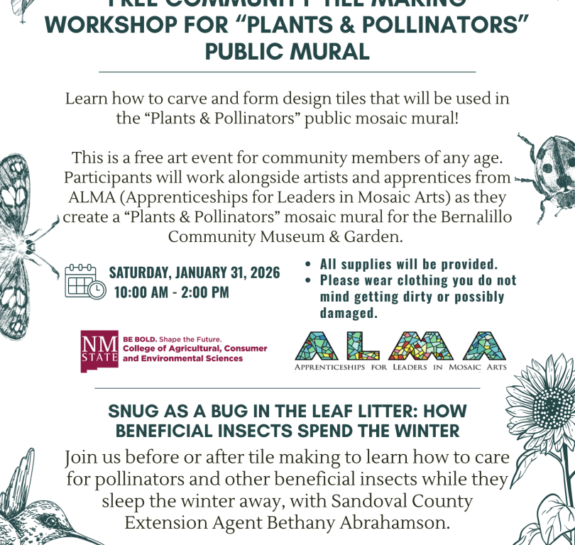 This is a free art event for community members of any age. Participants will work alongside artists and apprentices from ALMA (Apprenticeships for Leaders in Mosaic Arts) as they create a “Plants & Pollinators” mosaic mural for the Bernalillo Community Museum & Garden.