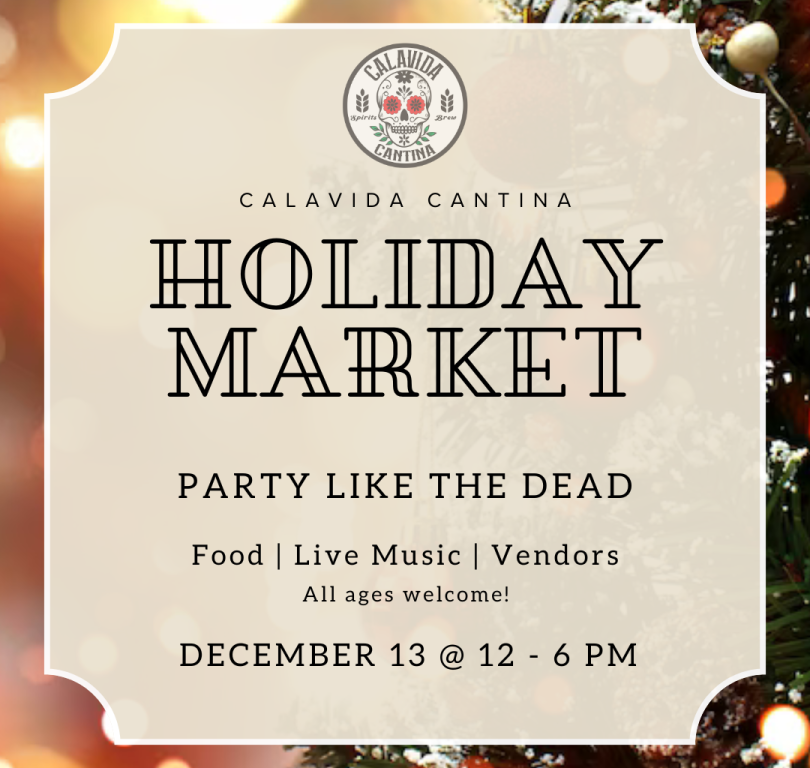 Calavida Cantina Holiday Market Dates: December 13, 2025 Location: Calavida Cantina 10200 Corrales Rd, Albuquerque, NM 87114 Email: nloveladycc@gmail.com Phone: (505) 375-2006 Time: 12:00 PM to 6:00 PM Price: FREE Visit Website Add to Trip Overview Holiday market: All ages welcome.Craft drinks | Food | Vendors | Live Music Map