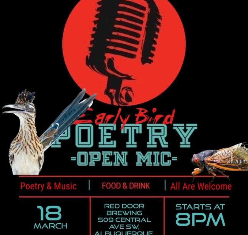 Kick off the Chicharra Poetry Slam Festival with our Early Bird Open Mic! Open to Albuquerque locals and visiting poets alike, this all-are-welcome open mic is the perfect way to warm up the week, share new work, and gather in community before the festival officially begins.