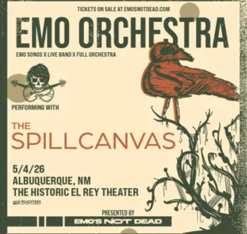 Emo Orchestra with The Spill Canvas - An Evening of Emo Presented By: El Rey Theater Dates: May 4, 2026 Location: El Rey Theater 622 Central Ave SW, Albuquerque, NM 87102 Time: 8:00 PM to 10:30 PM Price: $40.33 Visit Website Add to Trip Overview Emo Orchestra with The Spill Canvas - An Evening of Emo May 4, 2026 • 8:00 pm - 10:30 pm DOORS 7:00pm • All Ages Map