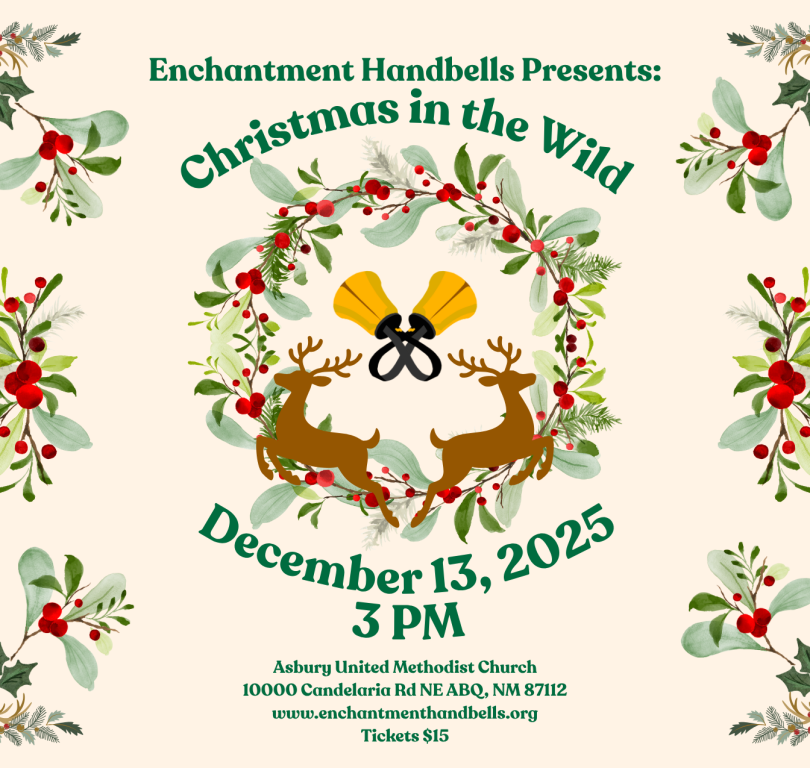 Enchantment Handbells presents: Christmas in the Wild Presented By: Enchantment Albuquerque Handbell Ensemble Dates: December 13, 2025 Location: Asbury United Methodist Church 10000 Candelaria Rd NE, Albuquerque, NM 87112 Email: enchantmentabqhandbells@gmail.com Phone: (505) 818-8214 Time: 3:00 PM to 4:00 PM Price: $15.00 Visit Website Add to Trip Overview Enchantment Handbells presents its Christmas concert "Christmas in the Wild." Tickets for this all ages concert are available online or at the door. Join us in celebrating the flora and fauna of the winter season! Map