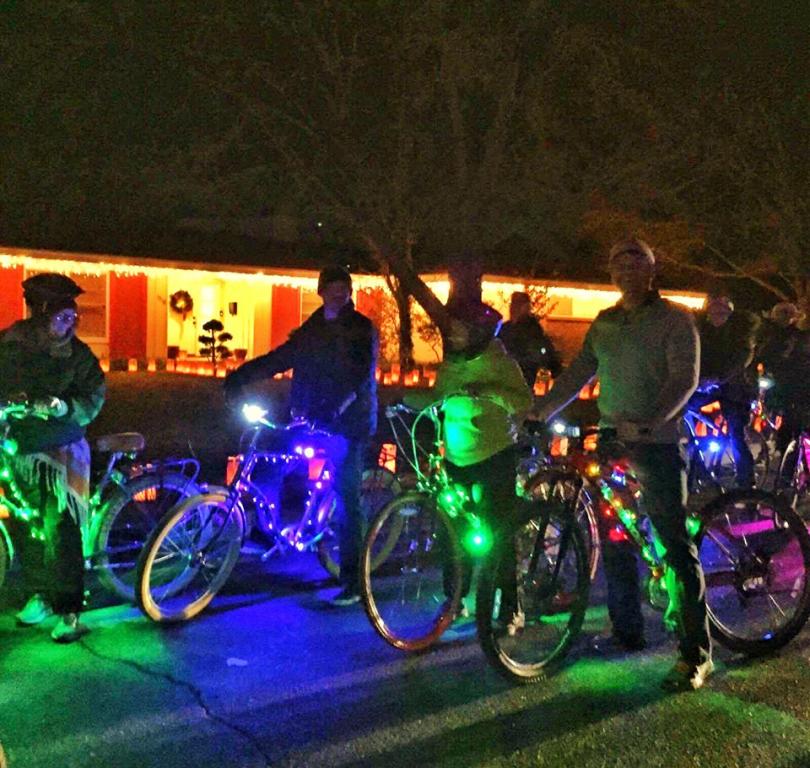 Difficulty Level: Beginner-friendly. Riders should feel comfortable biking alongside vehicles after dark.