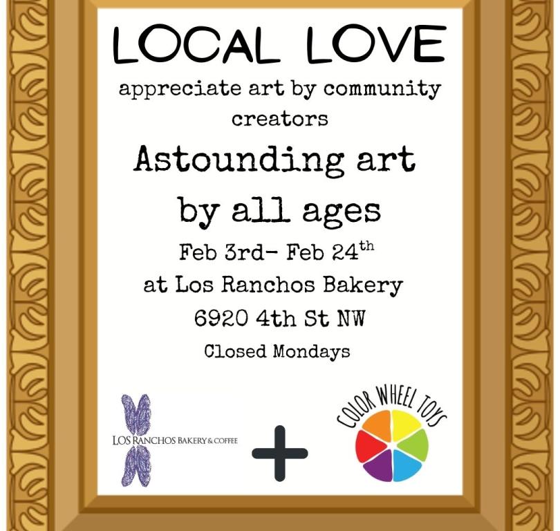 Local Love All Ages Art Show by community creators! This event is at Los Ranchos Bakery, put on by Color Wheel Toys. Over 15 local artists of all ages have shared a work of art they want you to see and enjoy. Stop by Los Ranchos Bakery (6920 4th St NW, Los Ranchos De Albuquerque, NM 87107) Tues- Fri 7-1, Sat 8-3, or Sun 8-1 through Feb 24th to get an eyeful.