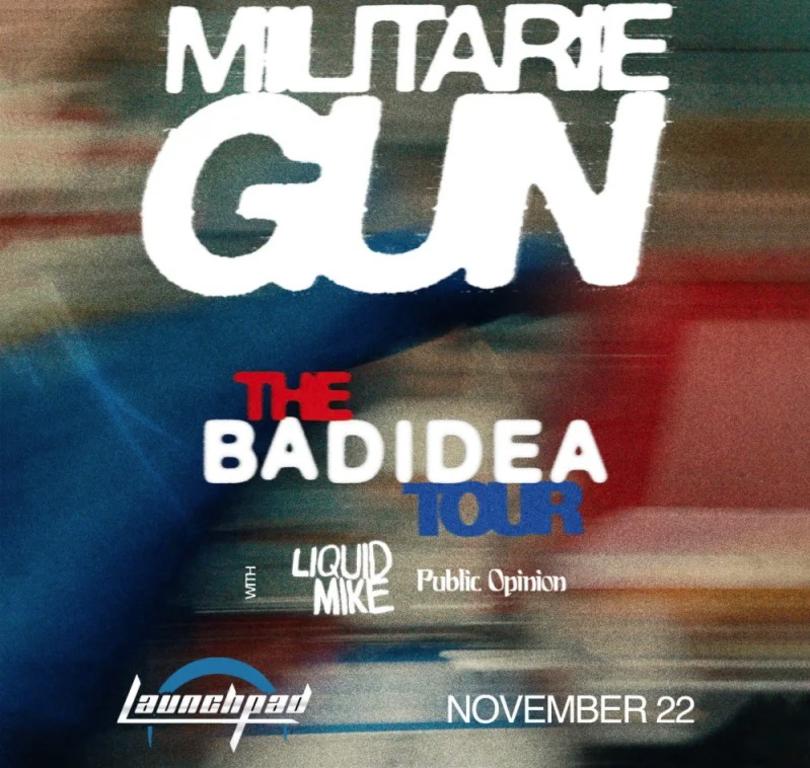 Militarie Gun * Liquid Mike * Public Opinion Dates: November 22, 2025 Location: Launchpad 120 Central Ave SW, Albuquerque, NM 87102 Time: 8:00 PM to 11:00 PM Price: $23.50 Visit Website Add to Trip Overview * Militarie Gun * Liquid Mike * Public Opinion * The Bad Idea Tour Doors 7pm | Show 8pm - All ages Advance tickets - $20 + service charge Ticket prices may increase day of show Map