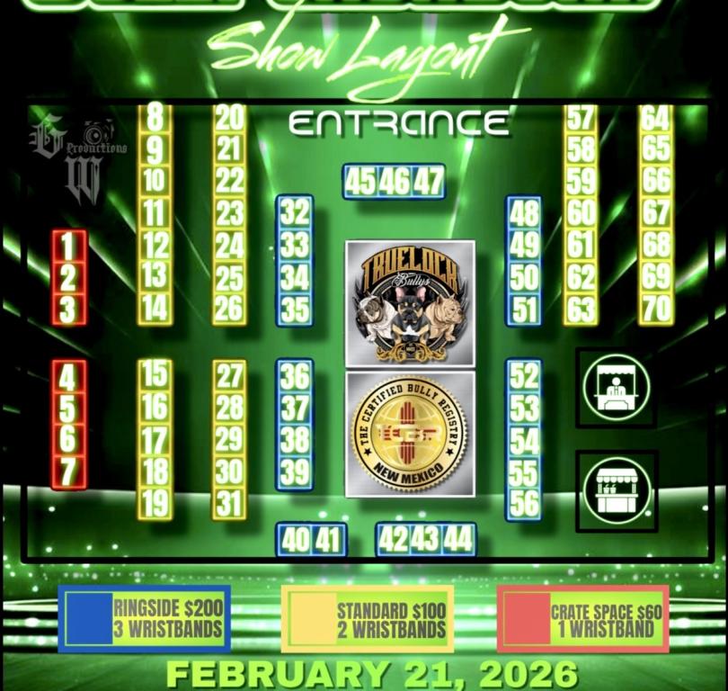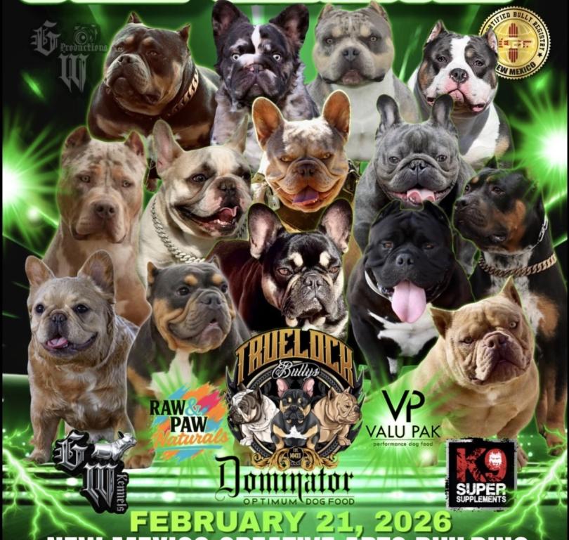 New Mexico’s True Bully Showdown Dates: February 21, 2026 Location: EXPO New Mexico - Home of the State Fair 300 San Pedro Drive, Lujan Building, Albuquerque, NM 87108 Email: qtruelock@gmail.com Phone: (505) 220-6156 Time: 8:00 AM to 8:00 PM Price: $10 - $20 Get Tickets Visit Website Add to Trip Overview Our 2nd Annual Dog Show will be going down on the 21st of February! This will be a fun, interactive event that the whole family can enjoy. Locals vendors, live talent & much more! Map