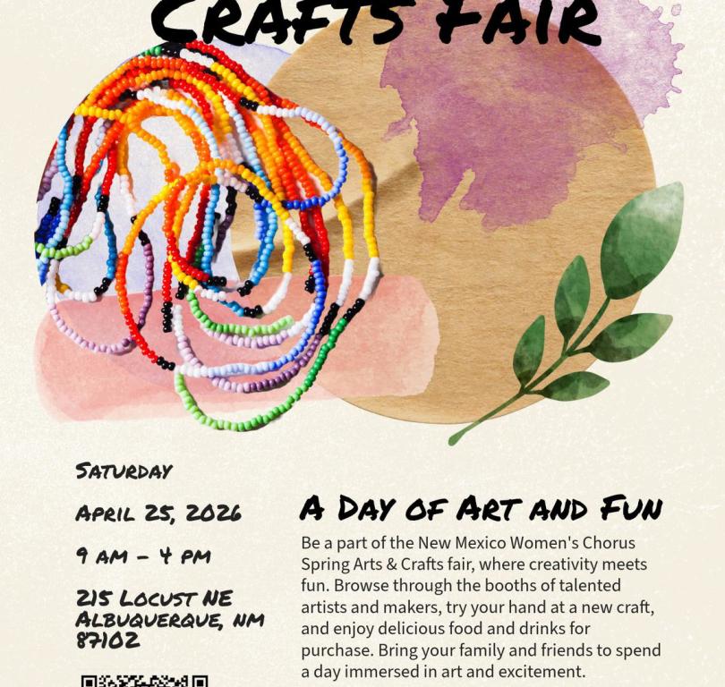 Spring Arts & Crafts Fair Presented By: New Mexico Women's Chorus Dates: April 25, 2026 Location: First Presbyterian Church of Albuquerque 215 Locust NE, Albuquerque, NM 87102 Time: 9:00 AM to 4:00 PM Price: FREE Visit Website Add to Trip Overview Be a part of the New Mexico Women's Chorus Spring Arts & Crafts Fair! Browse through booths of talented artists and makers and enjoy food and drinks for purchase. Map