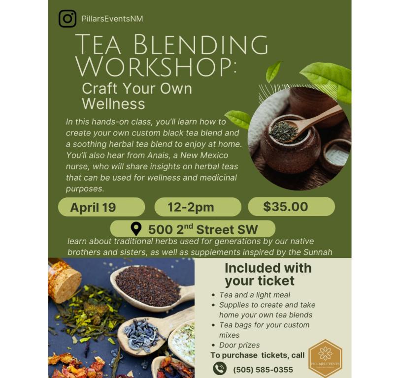 Join Pillars Events for this unique women’s tea blending workshop on Sunday, April 19th. In this hands-on workshop you’ll learn how to create your own black and herbal tea blends in addition to insights into herbal teas that can be used for medicinal purposes.