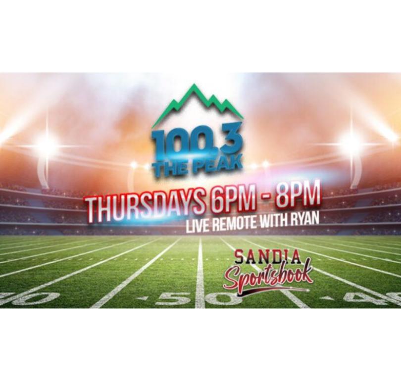 The Peak Radio Live Recurrence: Recurring weekly on Thursday Location: Sandia Sportsbook - Sandia Resort & Casino 30 Rainbow Rd. N.E., Albuquerque, NM 87113 Time: 6:00 PM to 8:00 PM Visit Website Add to Trip Overview Tune into The Peak 100.3 Live at Sandia Sportsbook! Watch the game live with Ryan from The Peak every Thursday. Map