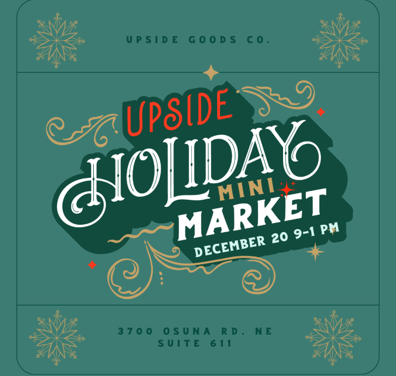 The Upside Holiday Mini Market is designed as a warm, welcoming space where families and neighbors can gather, shop local, and enjoy simple holiday magic. Visitors can explore handmade goods from New Mexico makers, savor fresh bites, enjoy festive music, a free library, and activities while they shop.