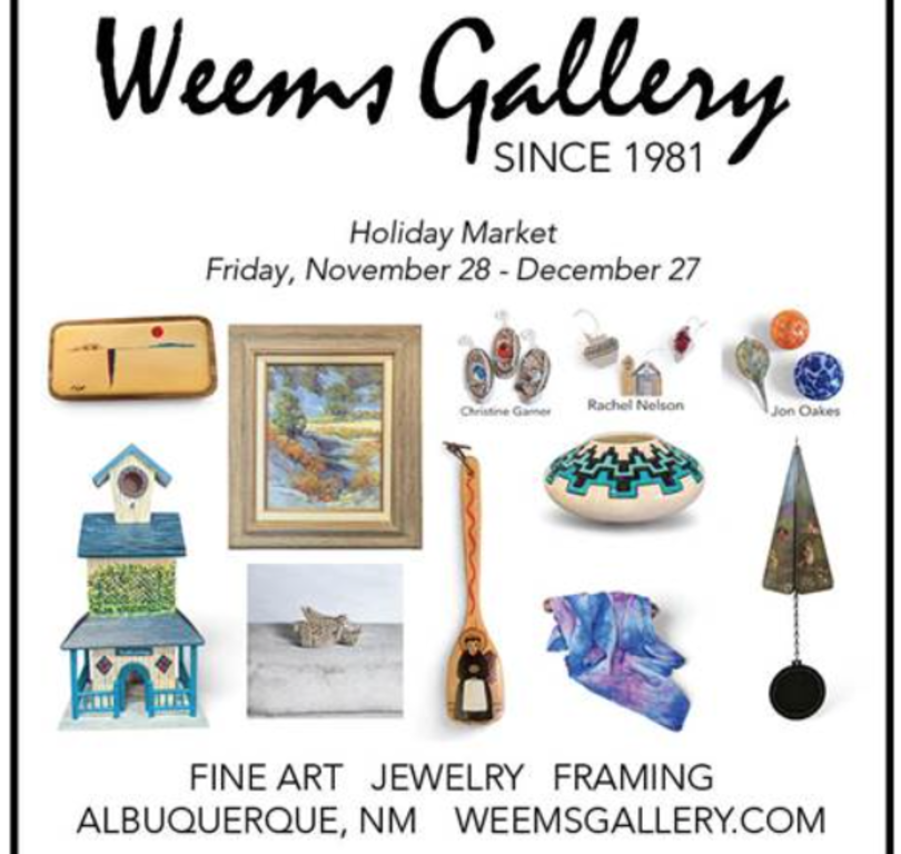 Weem's Holiday Market Dates: November 28, 2025 - December 27, 2025 Recurrence: Recurring weekly on Monday, Tuesday, Wednesday, Thursday, Friday, Saturday Location: Weems Gallery & Framing 5935 Wyoming Blvd NE, Albuquerque, NM 87109 Email: weems@weemsgallery.com Phone: (505) 293-6133 Time: 10:00 AM to 5:00 PM Price: FREE Visit Website Add to Trip Overview You are invited to our Holiday Market happening November 28th - December 27th! Come browse fine art, jewelry, and framing at Weems. Map