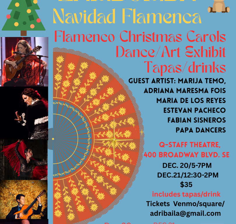 Christmas carols, Villancicos in Spanish, flamenco dancing, art exhibition and food! Tickets: Venmo QR or Square QR on poster more info: adribaila@gmail.com