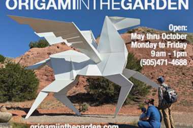 ORIGAMI IN THE GARDEN, an exhibition created by Santa Fe artists Jennifer and Kevin Box, features Box’s own compositions as well as collaborations with world-renowned origami artists Robert J. Lang, Te Jui Fu, Beth Johnson and Michael G. LaFosse. These remarkable artworks feel at home in the wondrous setting of botanical gardens, since paper originates in plant life and origami is made of paper. Gardens and art are both openings into broader connections around the globe, over time, and between the human and natural worlds. And gardens, like origami, begin with little—the tiniest of seeds—and burgeon through artful attention into glorious displays of flowers, bushes, and trees.